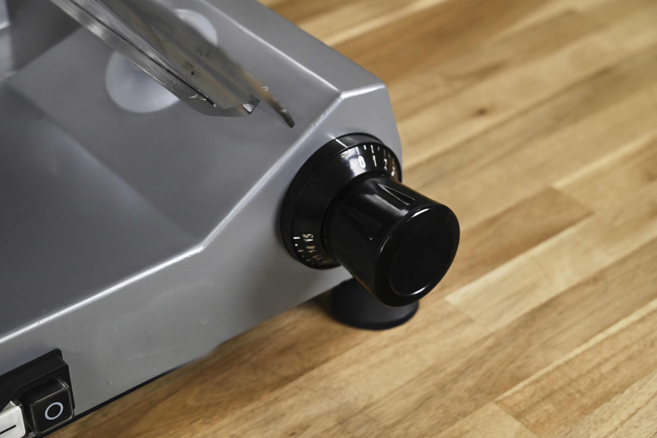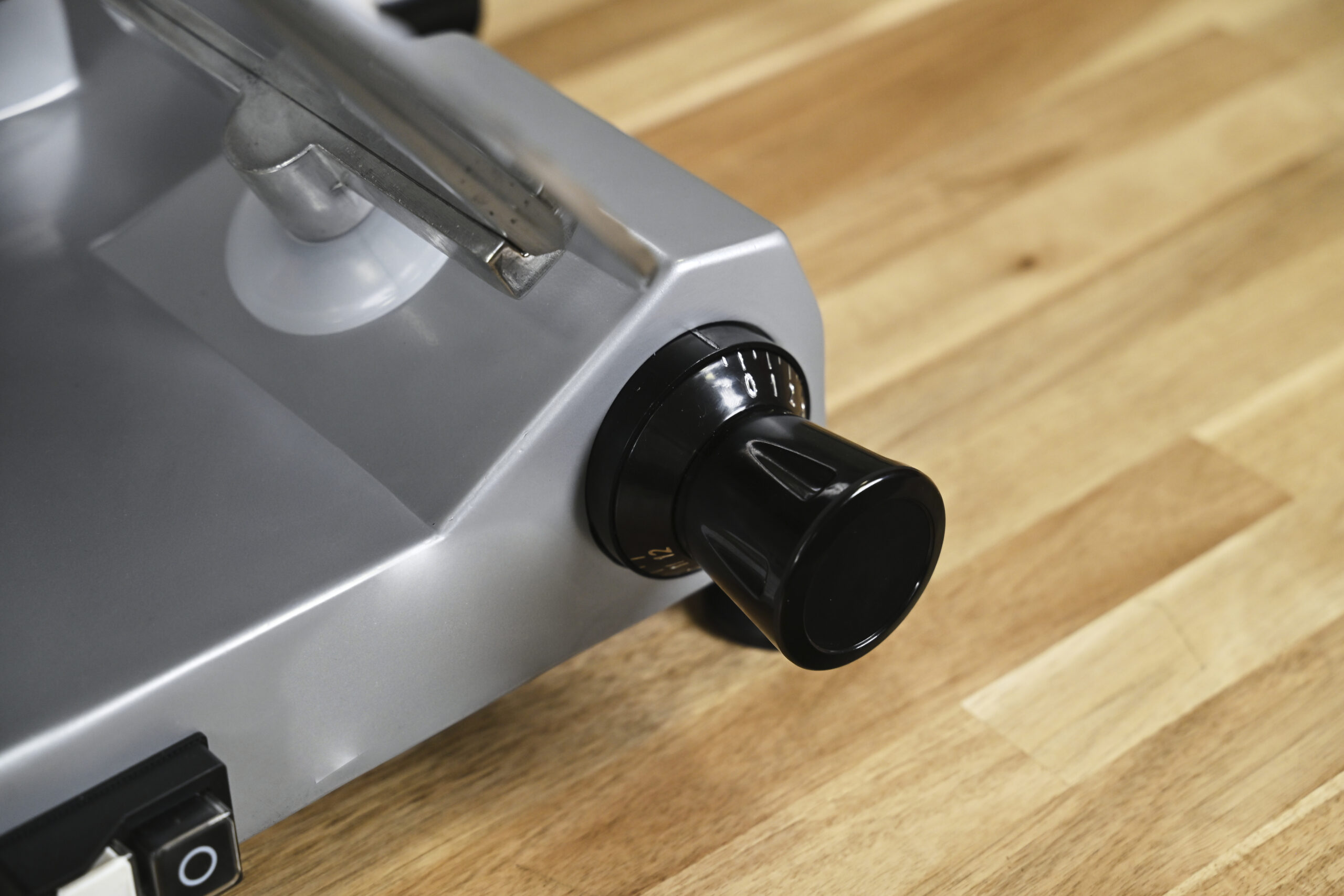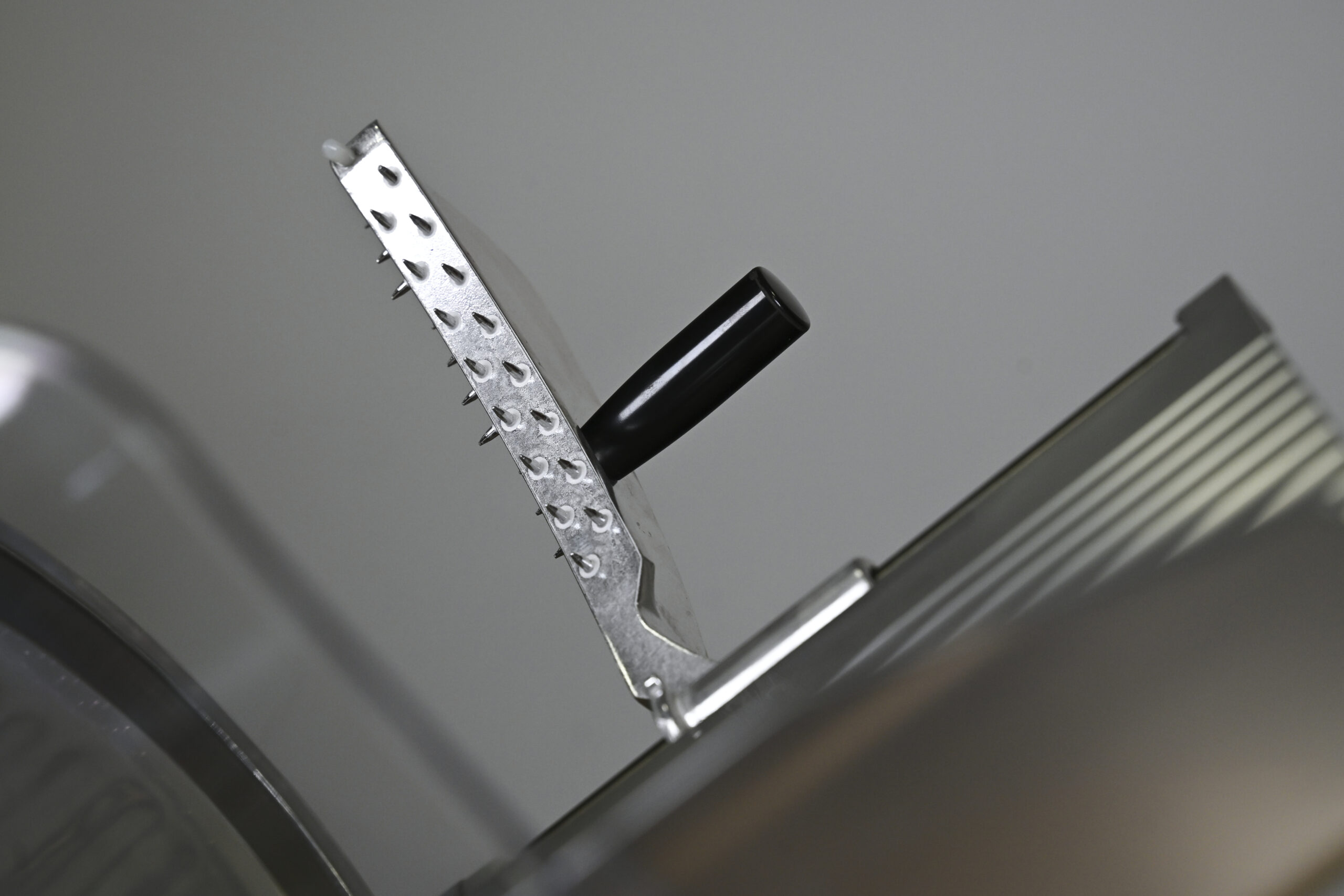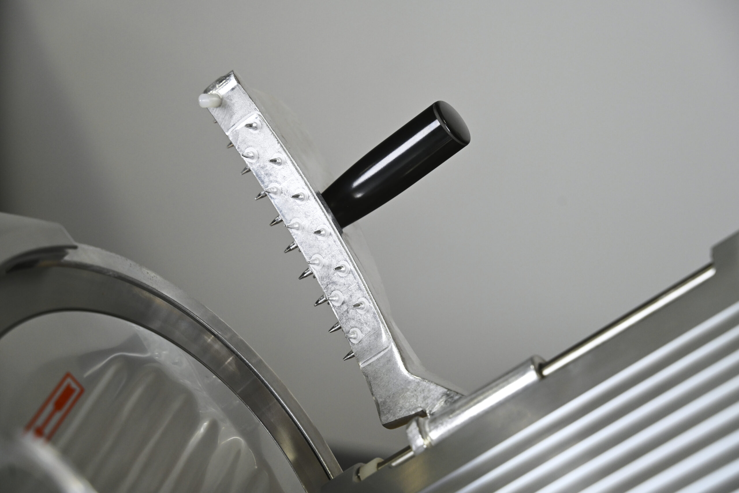 Profesionalna mesoreznica prečnika 300 mm kombinuje inox konstrukciju sa praktičnim plastičnim nosačem za ruku i plastičnim nogicama, što je čini stabilnom i jednostavnom za rukovanje. Integrisani oštrač održava sečivo uvek spremnim za precizne rezove, dok se debljina sečenja lako podešava potenciometrom do 15 mm.